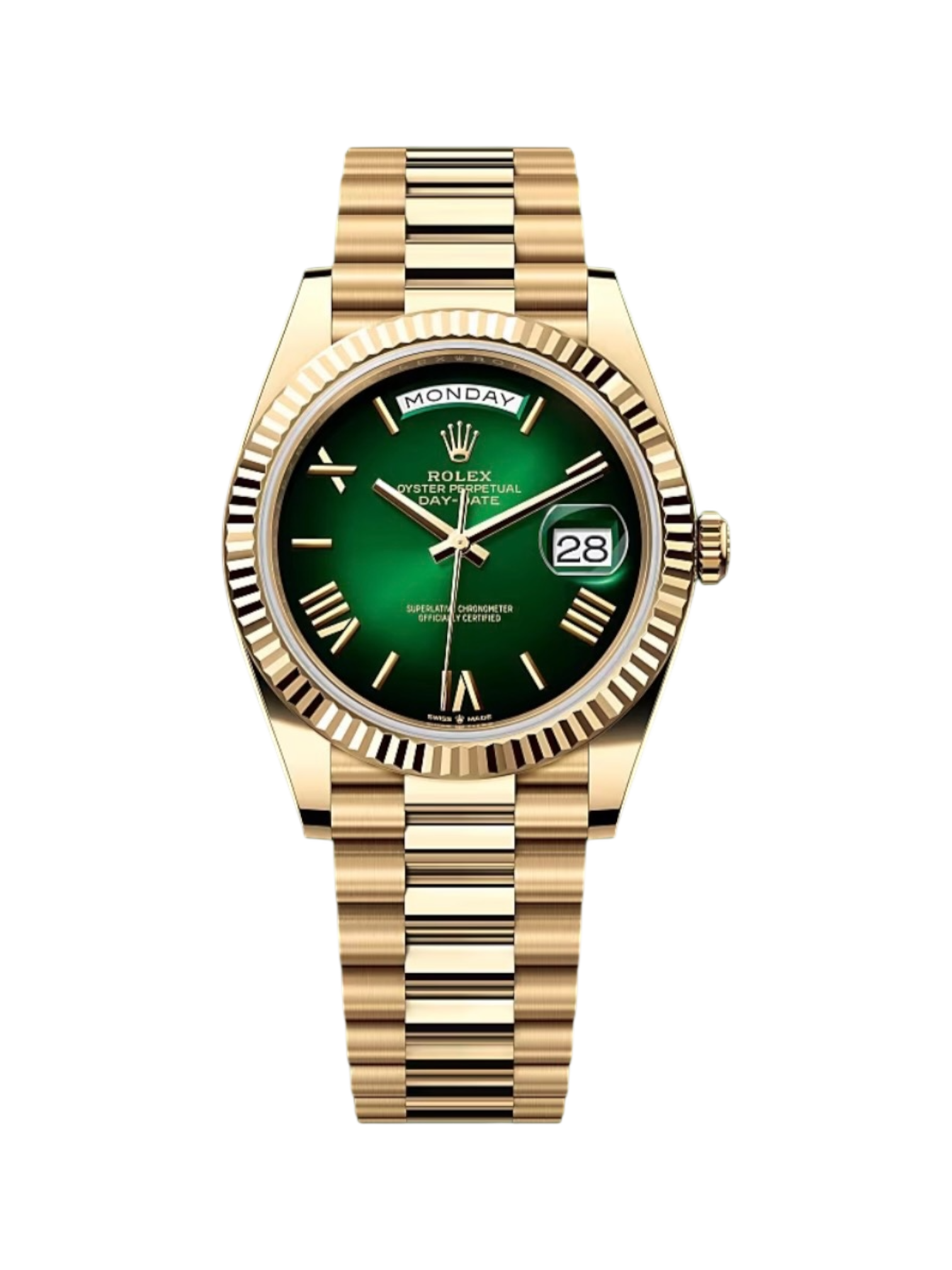 Cette Rolex Oyster Perpetual Day-Date 40 228238 en Or Jaune est dotée d’un cadran vert ombré, d’un bracelet Président et d’une lunette cannelée en or jaune.
