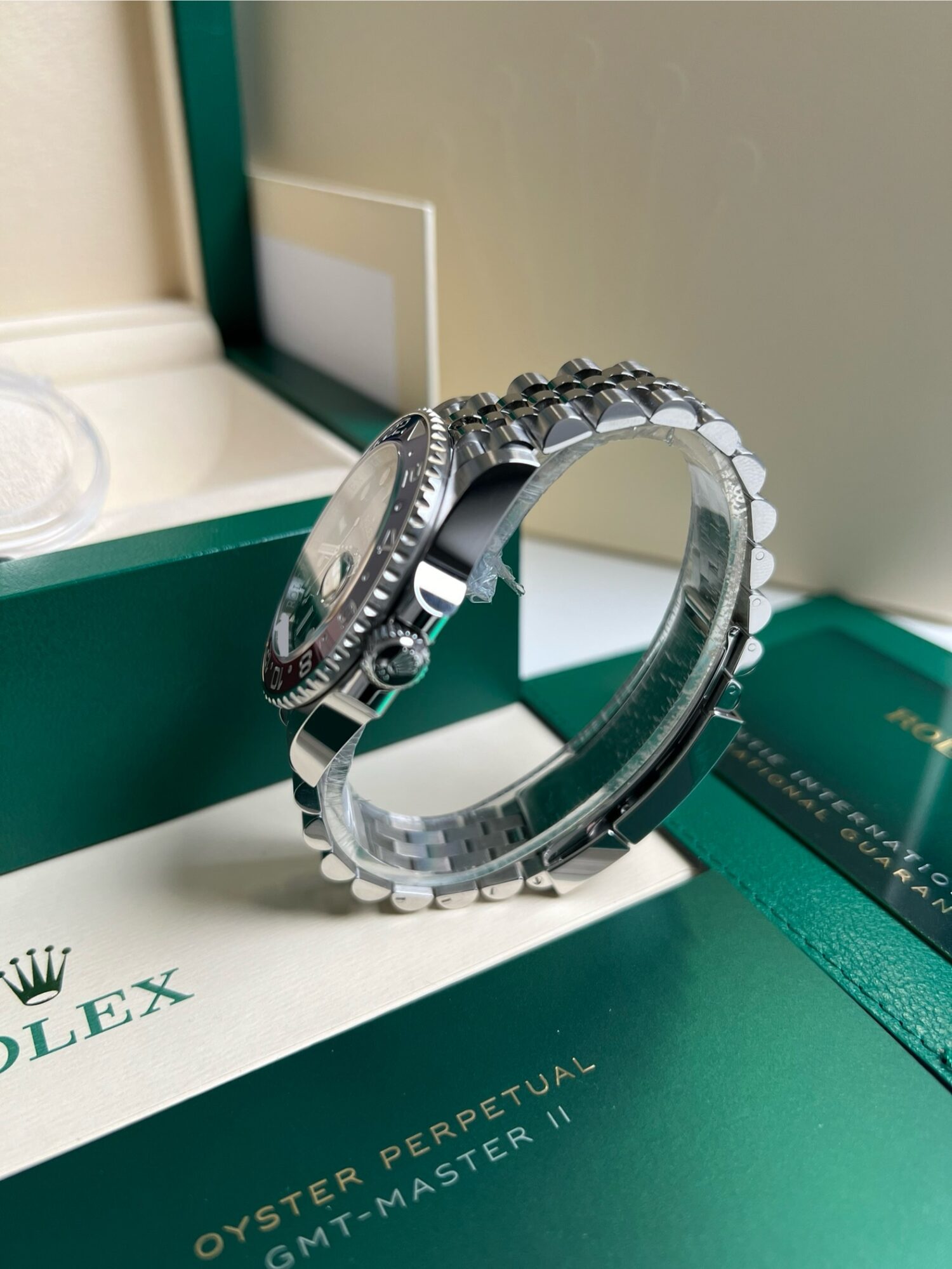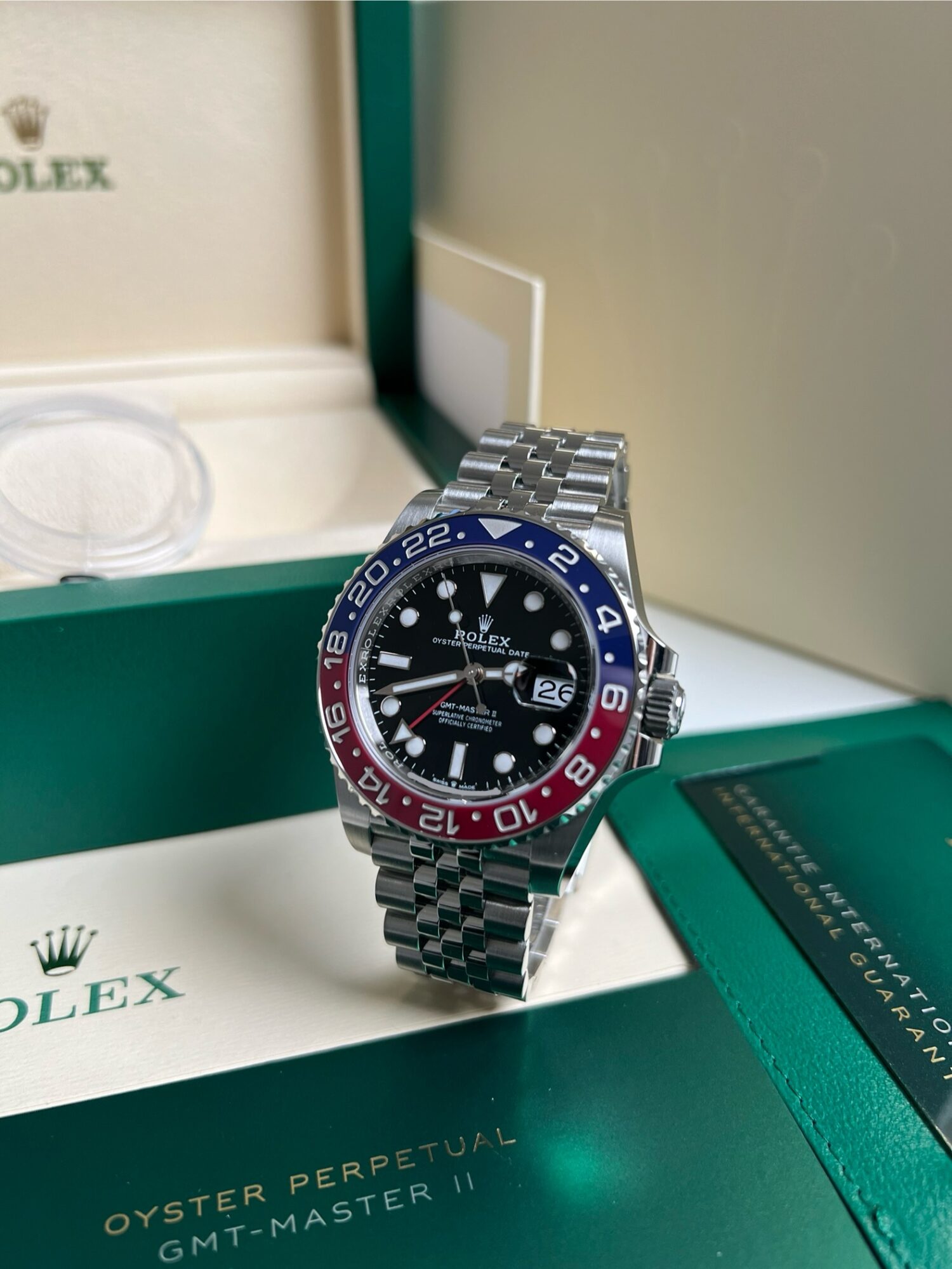 Cette Rolex Oyster Perpetual GMT Master II 126710 BLRO Pepsi Jubilee en acier Oystersteel est doté d’un cadran noir, d’un bracelet jubilée ainsi que d’un disque de lunette Cerachrom en céramique bleue et rouge bicolore qui lui vaut le surnom de Pepsi.