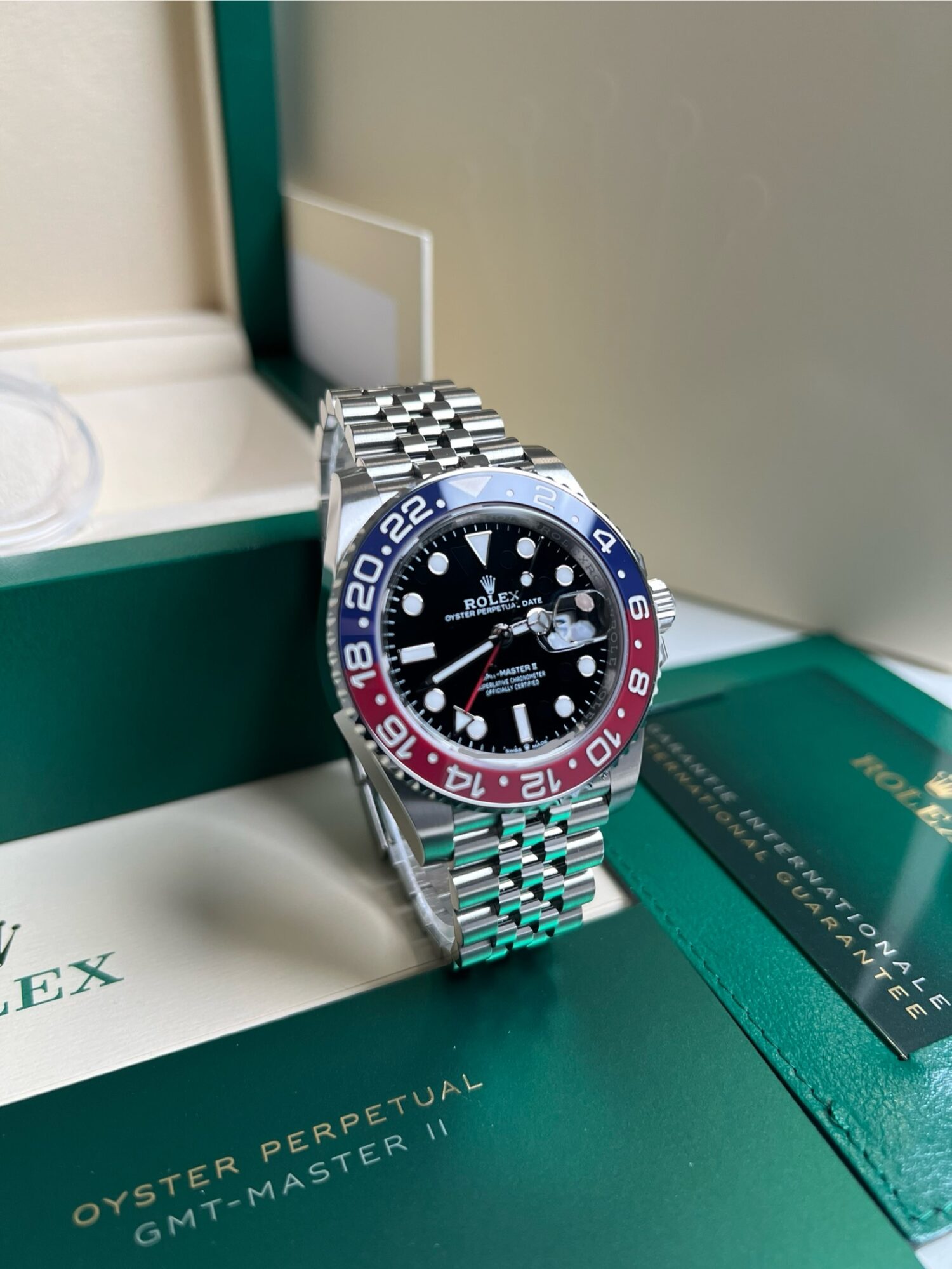 La Rolex GMT Master II 126710 BLRO Pepsi Jubilee arbore une aiguille supplémentaire faisant le tour du cadran en 24 heures, en complément des traditionnelles aiguilles des heures, minutes et secondes, ainsi qu’une lunette tournante bidirectionnelle graduée 24 heures.