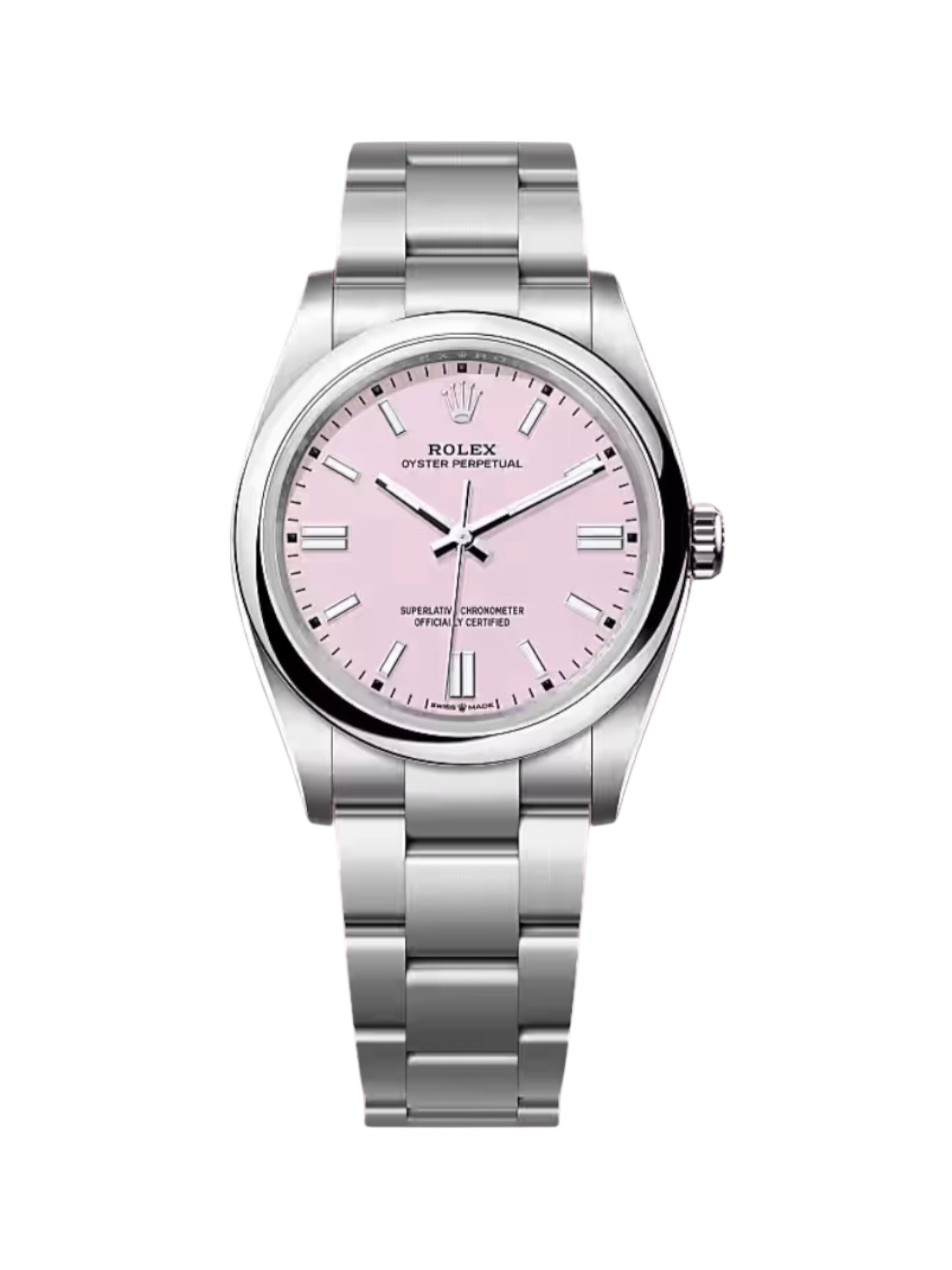 Cette Rolex Oyster Perpetual 36 Candy 126000 en acier Oystersteel est dotée d’un cadran rose bonbon et d’un bracelet Oyster.